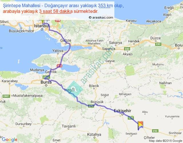 Şirintepe Mahallesi - Doğançayır arası yaklaşık olarak 90 km/h ile yukarıda belirtilen sürede olup, iki yerin kuş uçuşu uzaklığı (mesafesi) 231'dir. Yolculuk otobüsle 5 saat 9 dakika sürmektedir.