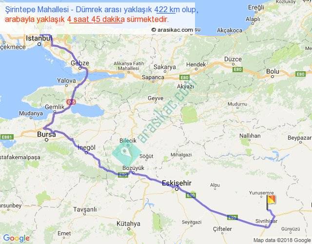 Şirintepe Mahallesi - Dümrek arası yaklaşık olarak 90 km/h ile yukarıda belirtilen sürede olup, iki yerin kuş uçuşu uzaklığı (mesafesi) 273'dir. Eğer belirtilen yerler arasında uçak seferi var ise bu süre uçakla 25 dakika'ya kadar düşebilir. Yolculuk otobüsle 6 saat 10 dakika sürmektedir.