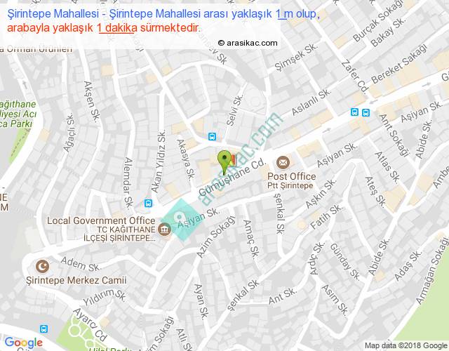 Şirintepe Mahallesi - Şirintepe Mahallesi arası yaklaşık olarak 90 km/h ile yukarıda belirtilen sürede olup, iki yerin kuş uçuşu uzaklığı (mesafesi) 0'dir. Yolculuk otobüsle 1 dakika sürmektedir.