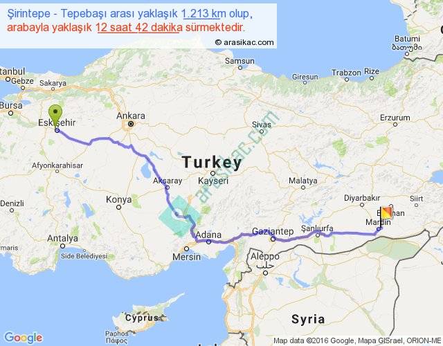Şirintepe - Tepebaşı arası yaklaşık olarak 90 km/h ile yukarıda belirtilen sürede olup, iki yerin kuş uçuşu uzaklığı (mesafesi) 933'dir. Eğer belirtilen yerler arasında uçak seferi var ise bu süre uçakla 1 saat 26 dakika'ya kadar düşebilir. Yolculuk otobüsle 16 saat 30 dakika sürmektedir.