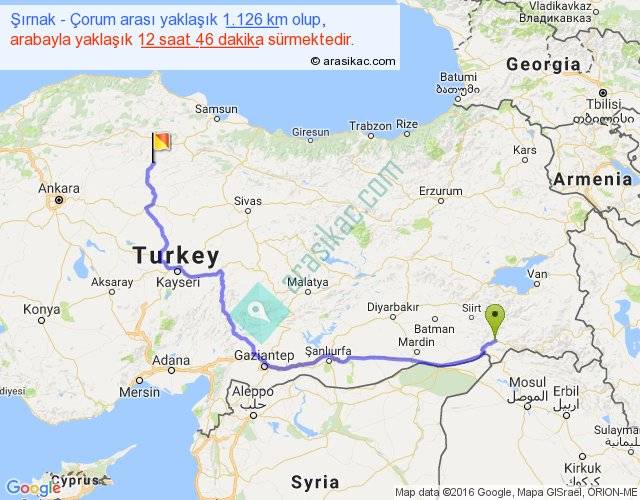 Şırnak - Çorum arası yaklaşık olarak 90 km/h ile yukarıda belirtilen sürede olup, iki yerin kuş uçuşu uzaklığı (mesafesi) 726'dir. Eğer belirtilen yerler arasında uçak seferi var ise bu süre uçakla 1 saat 07 dakika'ya kadar düşebilir. Yolculuk otobüsle 16 saat 35 dakika sürmektedir.