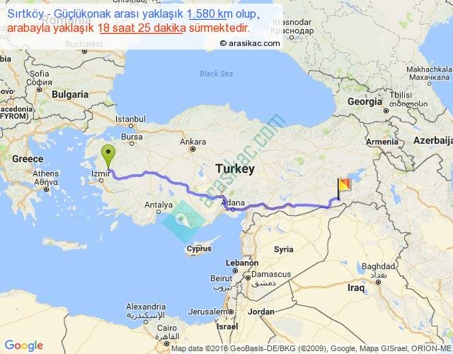 Sırtköy - Güçlükonak arası yaklaşık olarak 90 km/h ile yukarıda belirtilen sürede olup, iki yerin kuş uçuşu uzaklığı (mesafesi) 1253'dir. Eğer belirtilen yerler arasında uçak seferi var ise bu süre uçakla 1 saat 55 dakika'ya kadar düşebilir. Yolculuk otobüsle 23 saat 56 dakika sürmektedir.