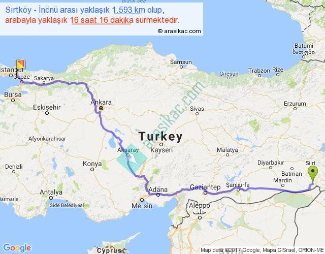 Sırtköy - İnönü arası yaklaşık olarak 90 km/h ile yukarıda belirtilen sürede olup, iki yerin kuş uçuşu uzaklığı (mesafesi) 1168'dir. Eğer belirtilen yerler arasında uçak seferi var ise bu süre uçakla 1 saat 47 dakika'ya kadar düşebilir. Yolculuk otobüsle 21 saat 8 dakika sürmektedir.