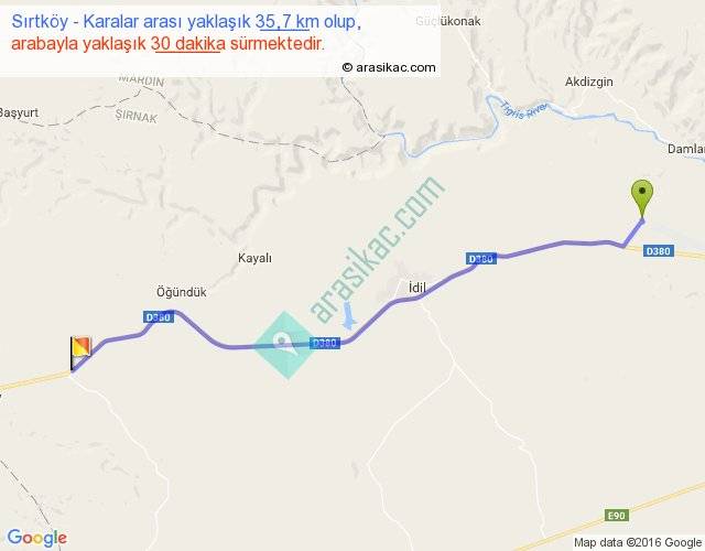 Sırtköy - Karalar arası yaklaşık olarak 90 km/h ile yukarıda belirtilen sürede olup, iki yerin kuş uçuşu uzaklığı (mesafesi) 32'dir. Yolculuk otobüsle 39 dakika sürmektedir.