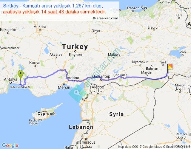 Sırtköy - Kumçatı arası yaklaşık olarak 90 km/h ile yukarıda belirtilen sürede olup, iki yerin kuş uçuşu uzaklığı (mesafesi) 956'dir. Eğer belirtilen yerler arasında uçak seferi var ise bu süre uçakla 1 saat 28 dakika'ya kadar düşebilir. Yolculuk otobüsle 19 saat 7 dakika sürmektedir.