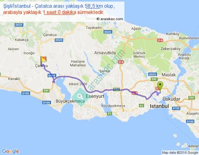 Şişli İstanbul - Çatalca arası yaklaşık olarak 90 km/h ile yukarıda belirtilen sürede olup, iki yerin kuş uçuşu uzaklığı (mesafesi) 45'dir. Yolculuk otobüsle 1 saat 18 dakika sürmektedir.