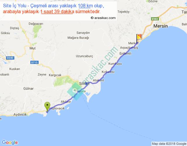 Site İç Yolu - Çeşmeli arası yaklaşık olarak 90 km/h ile yukarıda belirtilen sürede olup, iki yerin kuş uçuşu uzaklığı (mesafesi) 95'dir. Yolculuk otobüsle 2 saat 8 dakika sürmektedir.