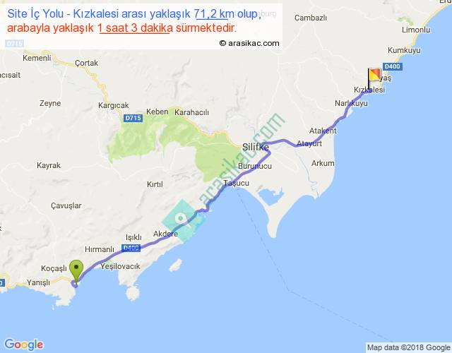 Site İç Yolu - Kızkalesi arası yaklaşık olarak 90 km/h ile yukarıda belirtilen sürede olup, iki yerin kuş uçuşu uzaklığı (mesafesi) 61'dir. Yolculuk otobüsle 1 saat 21 dakika sürmektedir.