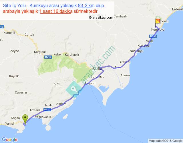 Site İç Yolu - Kumkuyu arası yaklaşık olarak 90 km/h ile yukarıda belirtilen sürede olup, iki yerin kuş uçuşu uzaklığı (mesafesi) 70'dir. Yolculuk otobüsle 1 saat 38 dakika sürmektedir.