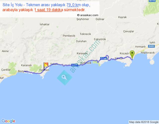 Site İç Yolu - Tekmen arası yaklaşık olarak 90 km/h ile yukarıda belirtilen sürede olup, iki yerin kuş uçuşu uzaklığı (mesafesi) 44'dir. Yolculuk otobüsle 1 saat 42 dakika sürmektedir.