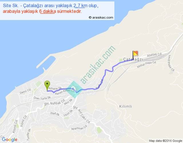 Site Sk. - Çatalağzı arası yaklaşık olarak 90 km/h ile yukarıda belirtilen sürede olup, iki yerin kuş uçuşu uzaklığı (mesafesi) 2'dir. Yolculuk otobüsle 7 dakika sürmektedir.