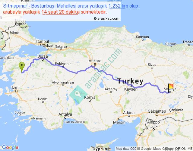 Sıtmapınar - Bostanbaşı Mahallesi arası yaklaşık olarak 90 km/h ile yukarıda belirtilen sürede olup, iki yerin kuş uçuşu uzaklığı (mesafesi) 929'dir. Eğer belirtilen yerler arasında uçak seferi var ise bu süre uçakla 1 saat 25 dakika'ya kadar düşebilir. Yolculuk otobüsle 18 saat 38 dakika sürmektedir.