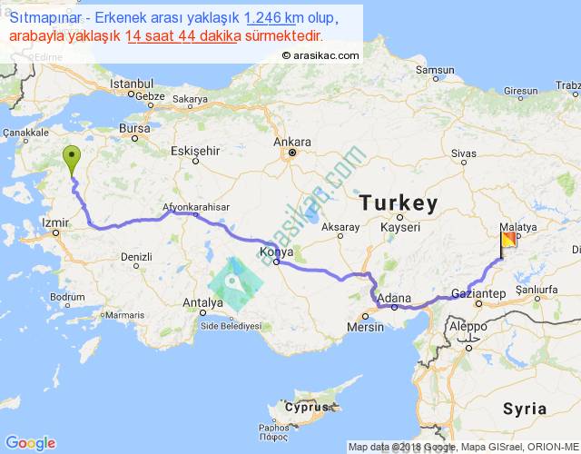 Sıtmapınar - Erkenek arası yaklaşık olarak 90 km/h ile yukarıda belirtilen sürede olup, iki yerin kuş uçuşu uzaklığı (mesafesi) 913'dir. Eğer belirtilen yerler arasında uçak seferi var ise bu süre uçakla 1 saat 24 dakika'ya kadar düşebilir. Yolculuk otobüsle 19 saat 9 dakika sürmektedir.