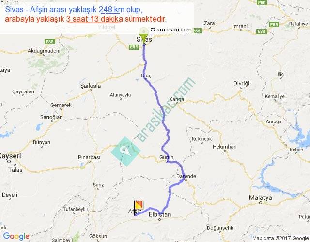 Sivas - Afşin arası yaklaşık olarak 90 km/h ile yukarıda belirtilen sürede olup, iki yerin kuş uçuşu uzaklığı (mesafesi) 167'dir. Yolculuk otobüsle 4 saat 10 dakika sürmektedir.