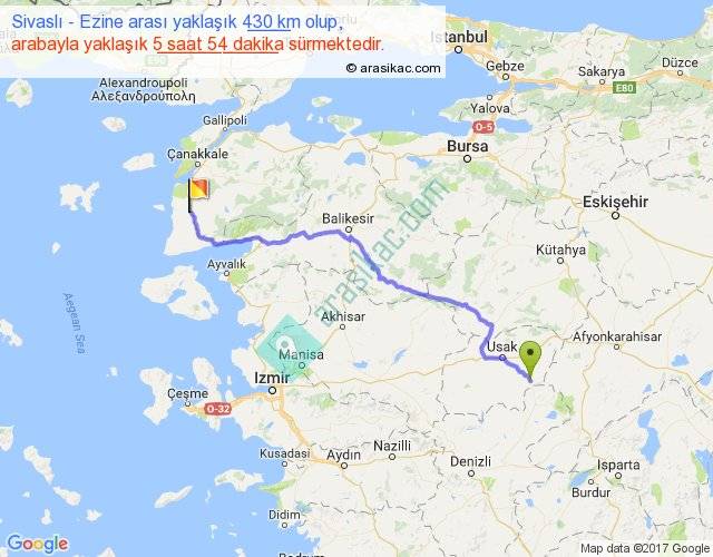 Sivaslı - Ezine arası yaklaşık olarak 90 km/h ile yukarıda belirtilen sürede olup, iki yerin kuş uçuşu uzaklığı (mesafesi) 320'dir. Eğer belirtilen yerler arasında uçak seferi var ise bu süre uçakla 29 dakika'ya kadar düşebilir. Yolculuk otobüsle 7 saat 40 dakika sürmektedir.