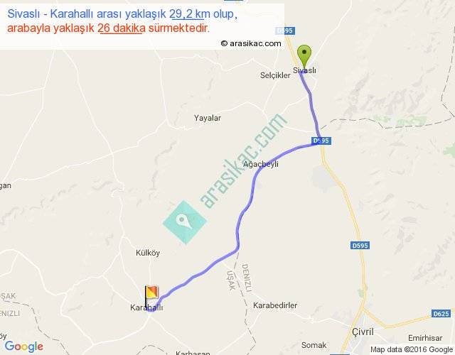 Sivaslı - Karahallı arası yaklaşık olarak 90 km/h ile yukarıda belirtilen sürede olup, iki yerin kuş uçuşu uzaklığı (mesafesi) 24'dir. Yolculuk otobüsle 33 dakika sürmektedir.