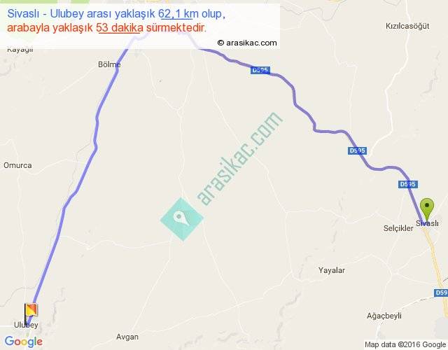 Sivaslı - Ulubey arası yaklaşık olarak 90 km/h ile yukarıda belirtilen sürede olup, iki yerin kuş uçuşu uzaklığı (mesafesi) 35'dir. Yolculuk otobüsle 1 saat 8 dakika sürmektedir.