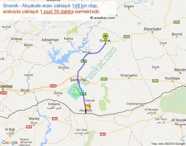 Siverek - Akçakale arası yaklaşık olarak 90 km/h ile yukarıda belirtilen sürede olup, iki yerin kuş uçuşu uzaklığı (mesafesi) 120'dir. Yolculuk otobüsle 2 saat 30 dakika sürmektedir.