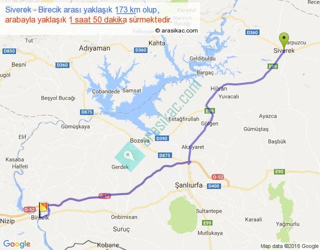 Siverek - Birecik arası yaklaşık olarak 90 km/h ile yukarıda belirtilen sürede olup, iki yerin kuş uçuşu uzaklığı (mesafesi) 143'dir. Yolculuk otobüsle 2 saat 23 dakika sürmektedir.