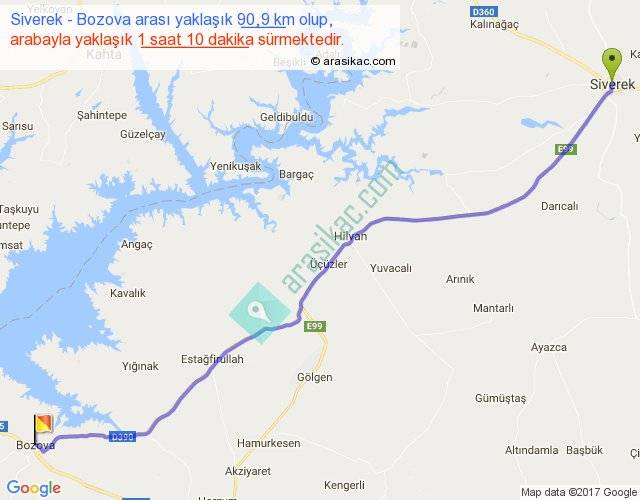 Siverek - Bozova arası yaklaşık olarak 90 km/h ile yukarıda belirtilen sürede olup, iki yerin kuş uçuşu uzaklığı (mesafesi) 82'dir. Yolculuk otobüsle 1 saat 32 dakika sürmektedir.
