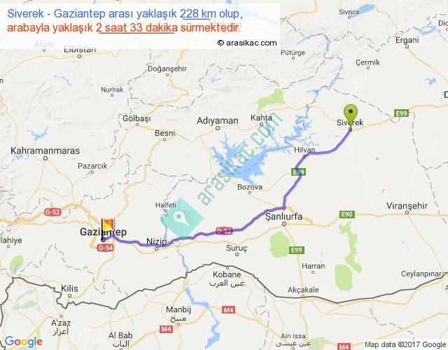 Siverek - Gaziantep arası yaklaşık olarak 90 km/h ile yukarıda belirtilen sürede olup, iki yerin kuş uçuşu uzaklığı (mesafesi) 187'dir. Yolculuk otobüsle 3 saat 18 dakika sürmektedir.