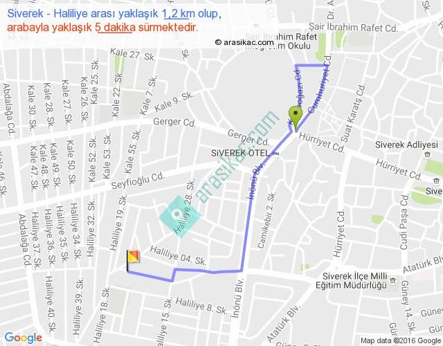 Siverek - Haliliye arası yaklaşık olarak 90 km/h ile yukarıda belirtilen sürede olup, iki yerin kuş uçuşu uzaklığı (mesafesi) 1'dir. Yolculuk otobüsle 6 dakika sürmektedir.