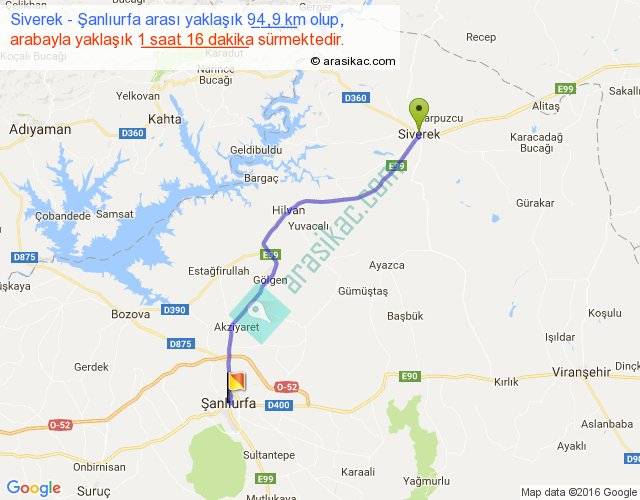 Siverek - Şanlıurfa arası yaklaşık olarak 90 km/h ile yukarıda belirtilen sürede olup, iki yerin kuş uçuşu uzaklığı (mesafesi) 79'dir. Yolculuk otobüsle 1 saat 38 dakika sürmektedir.