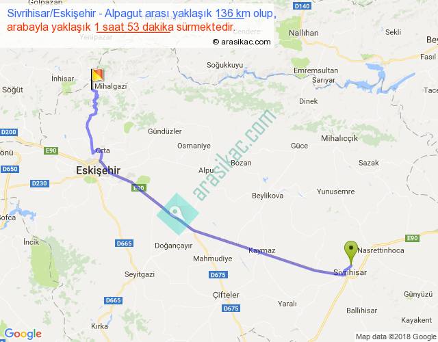 Sivrihisar Eskişehir - Alpagut arası yaklaşık olarak 90 km/h ile yukarıda belirtilen sürede olup, iki yerin kuş uçuşu uzaklığı (mesafesi) 107'dir. Yolculuk otobüsle 2 saat 26 dakika sürmektedir.