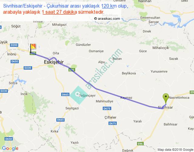 Sivrihisar Eskişehir - Çukurhisar arası yaklaşık olarak 90 km/h ile yukarıda belirtilen sürede olup, iki yerin kuş uçuşu uzaklığı (mesafesi) 111'dir. Yolculuk otobüsle 1 saat 53 dakika sürmektedir.
