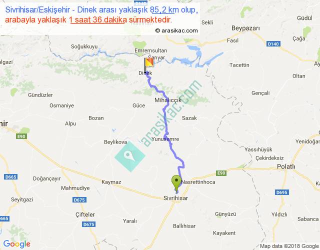 Sivrihisar Eskişehir - Dinek arası yaklaşık olarak 90 km/h ile yukarıda belirtilen sürede olup, iki yerin kuş uçuşu uzaklığı (mesafesi) 58'dir. Yolculuk otobüsle 2 saat 4 dakika sürmektedir.
