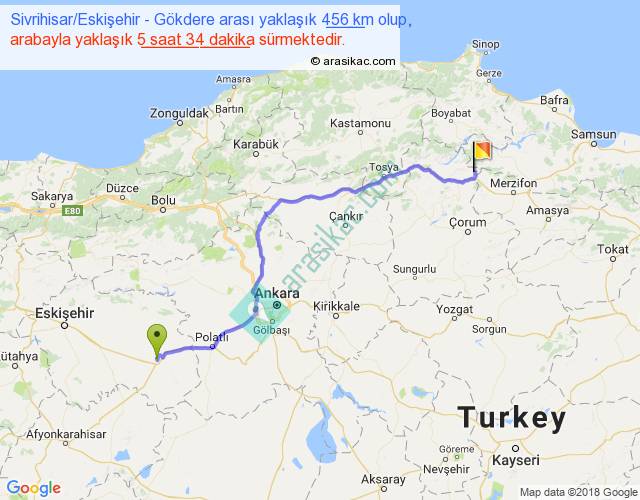 Sivrihisar Eskişehir - Gökdere arası yaklaşık olarak 90 km/h ile yukarıda belirtilen sürede olup, iki yerin kuş uçuşu uzaklığı (mesafesi) 342'dir. Eğer belirtilen yerler arasında uçak seferi var ise bu süre uçakla 31 dakika'ya kadar düşebilir. Yolculuk otobüsle 7 saat 14 dakika sürmektedir.