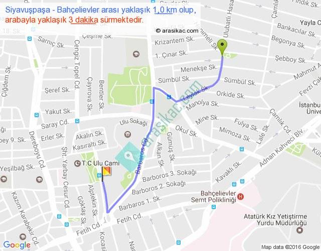 Siyavuşpaşa - Bahçelievler arası yaklaşık olarak 90 km/h ile yukarıda belirtilen sürede olup, iki yerin kuş uçuşu uzaklığı (mesafesi) 1'dir. Yolculuk otobüsle 3 dakika sürmektedir.