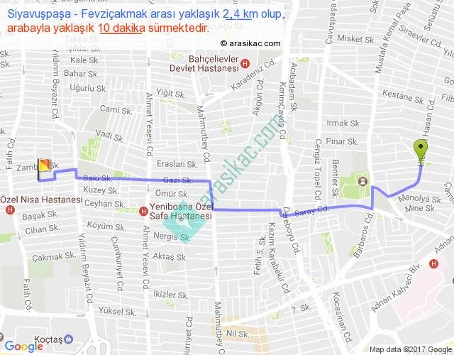 Siyavuşpaşa - Fevziçakmak arası yaklaşık olarak 90 km/h ile yukarıda belirtilen sürede olup, iki yerin kuş uçuşu uzaklığı (mesafesi) 2'dir. Yolculuk otobüsle 13 dakika sürmektedir.