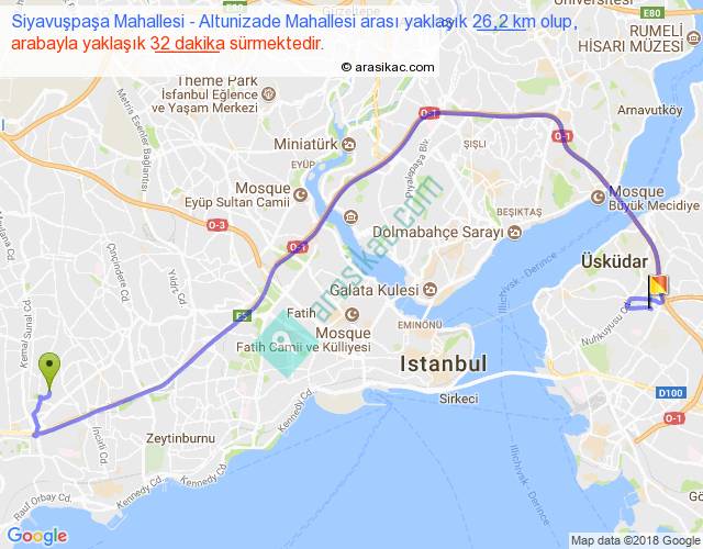 Siyavuşpaşa Mahallesi - Altunizade Mahallesi arası yaklaşık olarak 90 km/h ile yukarıda belirtilen sürede olup, iki yerin kuş uçuşu uzaklığı (mesafesi) 16'dir. Yolculuk otobüsle 41 dakika sürmektedir.