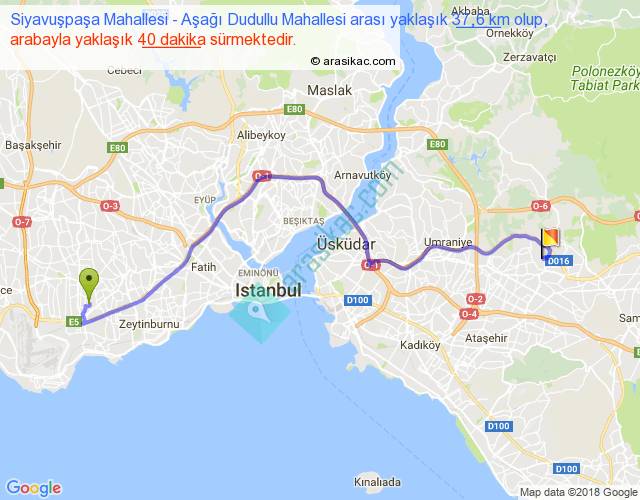 Siyavuşpaşa Mahallesi - Aşağı Dudullu Mahallesi arası yaklaşık olarak 90 km/h ile yukarıda belirtilen sürede olup, iki yerin kuş uçuşu uzaklığı (mesafesi) 26'dir. Yolculuk otobüsle 52 dakika sürmektedir.