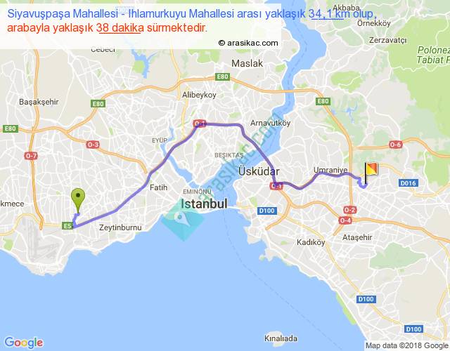 Siyavuşpaşa Mahallesi - Ihlamurkuyu Mahallesi arası yaklaşık olarak 90 km/h ile yukarıda belirtilen sürede olup, iki yerin kuş uçuşu uzaklığı (mesafesi) 24'dir. Yolculuk otobüsle 49 dakika sürmektedir.