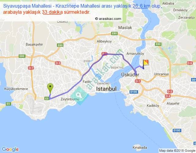 Siyavuşpaşa Mahallesi - Kirazlıtepe Mahallesi arası yaklaşık olarak 90 km/h ile yukarıda belirtilen sürede olup, iki yerin kuş uçuşu uzaklığı (mesafesi) 18'dir. Yolculuk otobüsle 42 dakika sürmektedir.