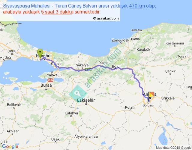 Siyavuşpaşa Mahallesi - Turan Güneş Bulvarı arası yaklaşık olarak 90 km/h ile yukarıda belirtilen sürede olup, iki yerin kuş uçuşu uzaklığı (mesafesi) 359'dir. Eğer belirtilen yerler arasında uçak seferi var ise bu süre uçakla 33 dakika'ya kadar düşebilir. Yolculuk otobüsle 6 saat 33 dakika sürmektedir.