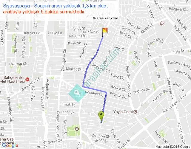 Siyavuşpaşa - Soğanlı arası yaklaşık olarak 90 km/h ile yukarıda belirtilen sürede olup, iki yerin kuş uçuşu uzaklığı (mesafesi) 1'dir. Yolculuk otobüsle 6 dakika sürmektedir.