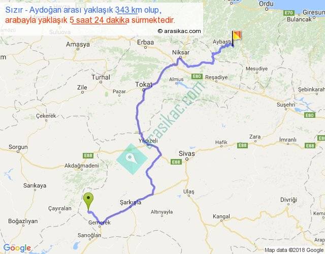 Sızır - Aydoğan arası yaklaşık olarak 90 km/h ile yukarıda belirtilen sürede olup, iki yerin kuş uçuşu uzaklığı (mesafesi) 201'dir. Yolculuk otobüsle 7 saat 1 dakika sürmektedir.