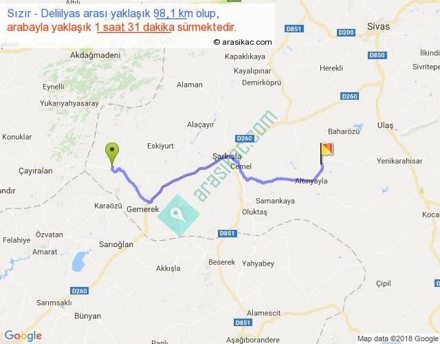 Sızır - Deliilyas arası yaklaşık olarak 90 km/h ile yukarıda belirtilen sürede olup, iki yerin kuş uçuşu uzaklığı (mesafesi) 72'dir. Yolculuk otobüsle 1 saat 58 dakika sürmektedir.