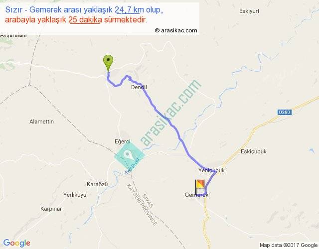 Sızır - Gemerek arası yaklaşık olarak 90 km/h ile yukarıda belirtilen sürede olup, iki yerin kuş uçuşu uzaklığı (mesafesi) 18'dir. Yolculuk otobüsle 32 dakika sürmektedir.