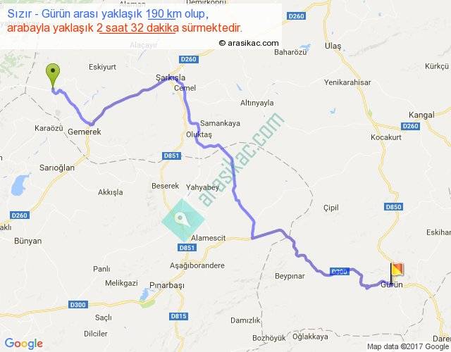 Eğer Sızır Gürün arası ne kadar yakar (benzin/mazot) diyorsanız, kilometrede 3 ₺ yakan bir aracınız var ise 570, km'de 4 ₺ yakan bir aracınız var ise 760, km'de 5 ₺ yakan bir aracınız var ise 950 ile bu yolculuğu tamamlayabilirsiniz.