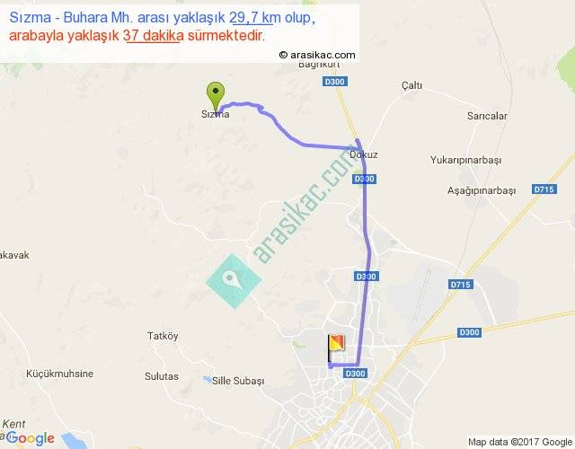 Sızma - Buhara Mh. arası yaklaşık olarak 90 km/h ile yukarıda belirtilen sürede olup, iki yerin kuş uçuşu uzaklığı (mesafesi) 18'dir. Yolculuk otobüsle 48 dakika sürmektedir.