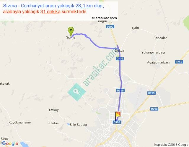 Sızma - Cumhuriyet arası yaklaşık olarak 90 km/h ile yukarıda belirtilen sürede olup, iki yerin kuş uçuşu uzaklığı (mesafesi) 19'dir. Yolculuk otobüsle 40 dakika sürmektedir.