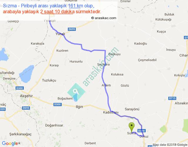 Sızma - Piribeyli arası yaklaşık olarak 90 km/h ile yukarıda belirtilen sürede olup, iki yerin kuş uçuşu uzaklığı (mesafesi) 113'dir. Yolculuk otobüsle 2 saat 49 dakika sürmektedir.