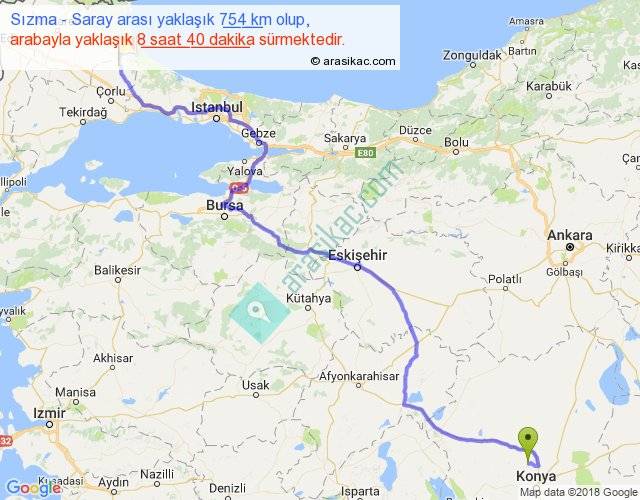Sızma - Saray arası yaklaşık olarak 90 km/h ile yukarıda belirtilen sürede olup, iki yerin kuş uçuşu uzaklığı (mesafesi) 531'dir. Eğer belirtilen yerler arasında uçak seferi var ise bu süre uçakla 49 dakika'ya kadar düşebilir. Yolculuk otobüsle 11 saat 16 dakika sürmektedir.