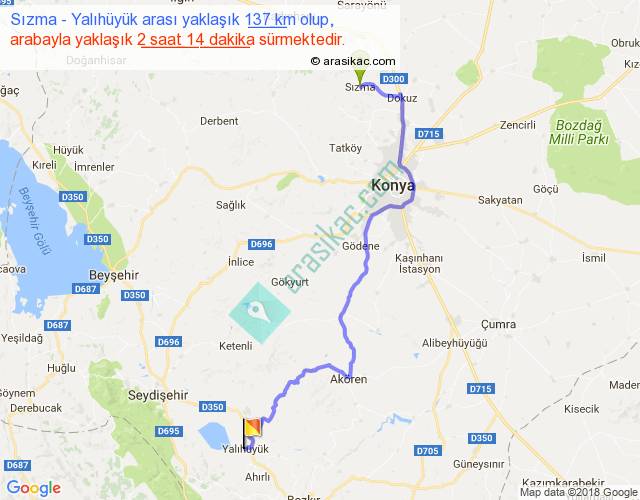 Sızma - Yalıhüyük arası yaklaşık olarak 90 km/h ile yukarıda belirtilen sürede olup, iki yerin kuş uçuşu uzaklığı (mesafesi) 91'dir. Yolculuk otobüsle 2 saat 54 dakika sürmektedir.