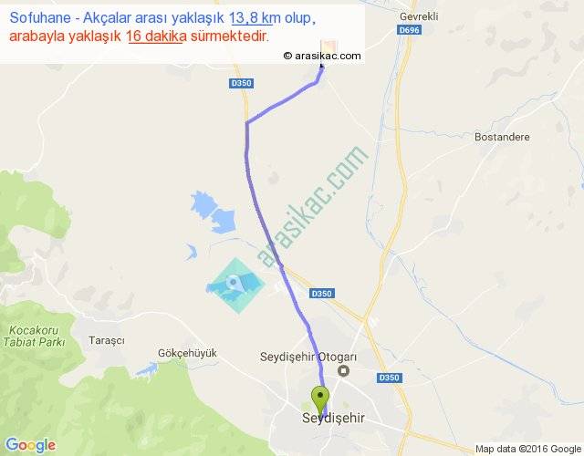 Sofuhane - Akçalar arası yaklaşık olarak 90 km/h ile yukarıda belirtilen sürede olup, iki yerin kuş uçuşu uzaklığı (mesafesi) 12'dir. Yolculuk otobüsle 20 dakika sürmektedir.