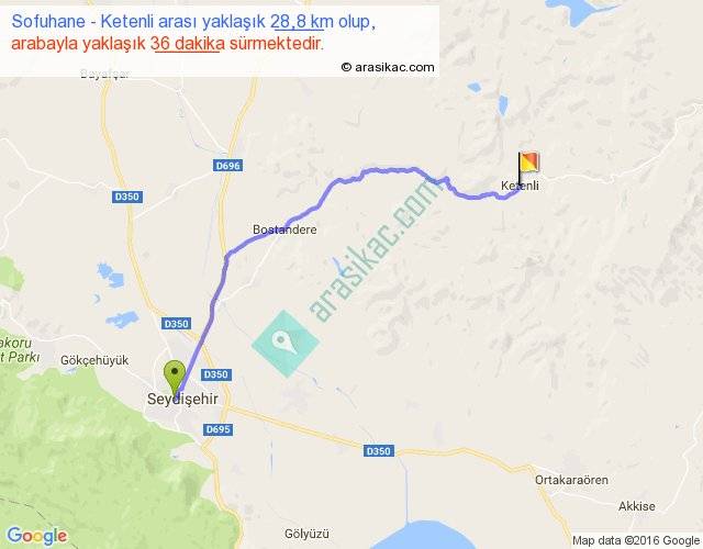 Sofuhane - Ketenli arası yaklaşık olarak 90 km/h ile yukarıda belirtilen sürede olup, iki yerin kuş uçuşu uzaklığı (mesafesi) 22'dir. Yolculuk otobüsle 46 dakika sürmektedir.